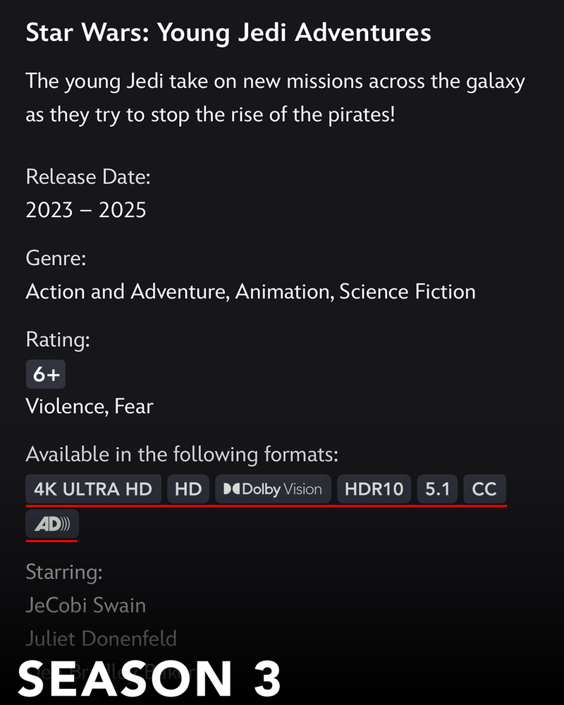Прочитать отчет 10-KТретий и заключительный сезон Star Wars: Young Jedi Adventures теперь доступен для просмотра на Disney+, и это первый сезон, доступный в разрешении 4K. Предыдущие два сезона по-прежнему доступны в HD.