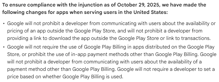 Google подтвердила, что выполняет недавнее судебное постановление, обновив свою справочную документацию. Теперь разработчики приложений в США могут выбирать использование платёжных систем за пределами Google Play Store. Это может означать более низкие цены для пользователей, поскольку разработчикам не придётся платить Google комиссию – которая может достигать 30%. Разработчикам также разрешено сообщать пользователям, как скачивать приложения и совершать платежи напрямую, минуя Play Store.