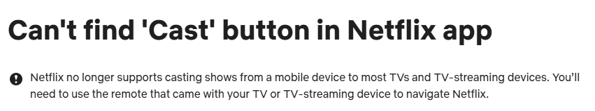 Chromecast раньше был известен тем, что позволял людям смотреть Netflix без необходимости использования дополнительных устройств, но теперь большинство смарт-телевизоров имеют встроенное приложение Netflix. Кроме того, Netflix активно работает над предотвращением совместного использования аккаунтов и просмотра на незнакомых устройствах. Недавно они обновили свое Android-приложение, чтобы ограничить возможности трансляции, подобно тому, как они удалили поддержку AirPlay в 2019 году.