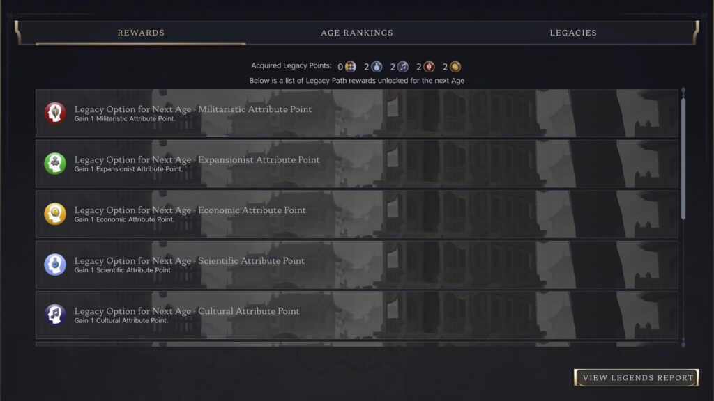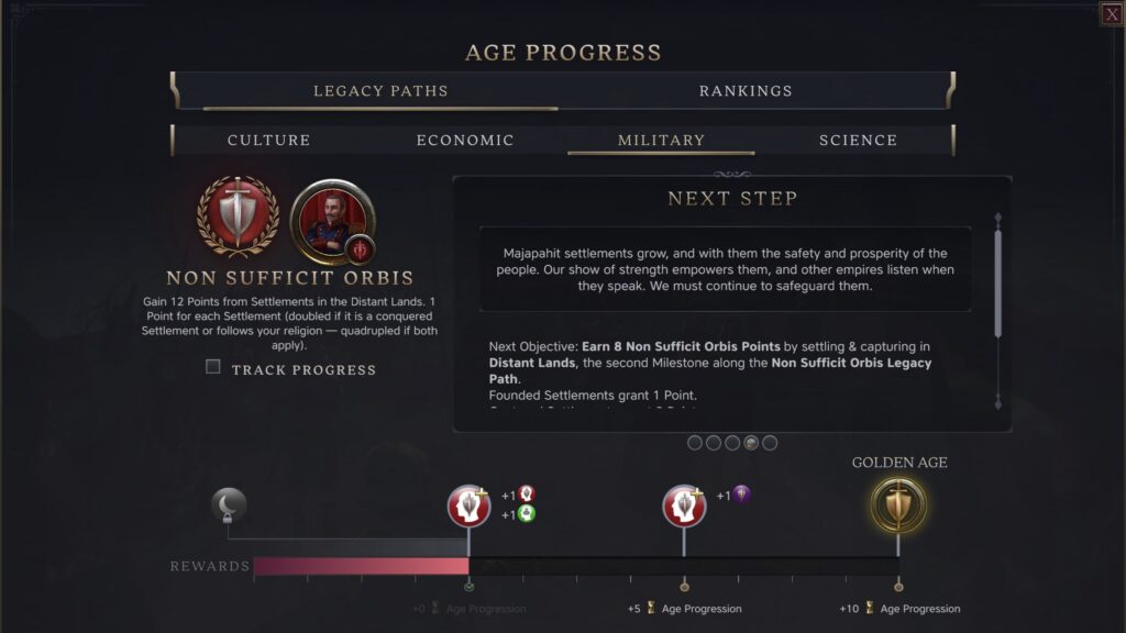 В отличие от игр с фиксированными целями, игроки смогут выбирать из широкого спектра достижений. Каждое достижение усиливает одну из шести областей – культуру, военную мощь, экономику, науку, дипломатию или экспансию – и предоставляет либо мгновенную выгоду, либо карту, дающую им преимущество в начале следующей эры.