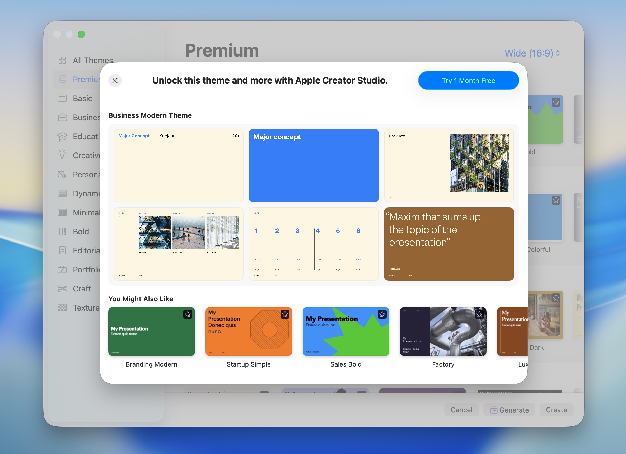 Основное различие между обычными приложениями и приложениями Creator Studio наиболее заметно проявляется в Keynote, Pages и Numbers. Эти приложения выглядят идентично независимо от статуса подписки, но бесплатные версии будут предлагать вам перейти на Creator Studio при попытке использовать функции, требующие подписки, такие как шаблоны документов и инструменты на основе ИИ.