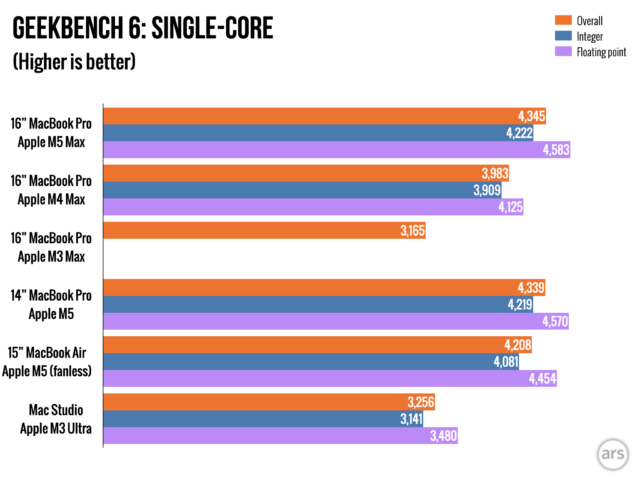 Чип M5 Max в 14-дюймовом MacBook Pro предлагает схожую производительность в одноядерном режиме с обычным чипом M5. Это типично для Apple – при переходе на более мощный чип вы обычно видите улучшения в задачах, использующих несколько ядер и графику, но Apple не так сильно увеличивает скорость отдельных ядер, как компании, такие как Intel и AMD, делают со своими топовыми процессорами.