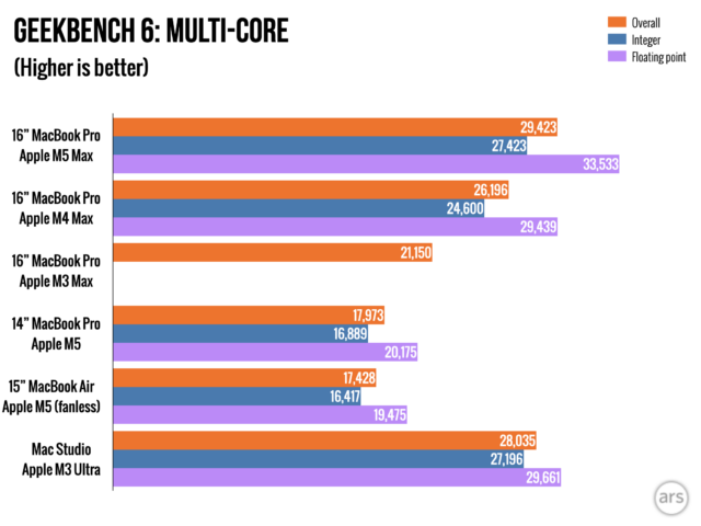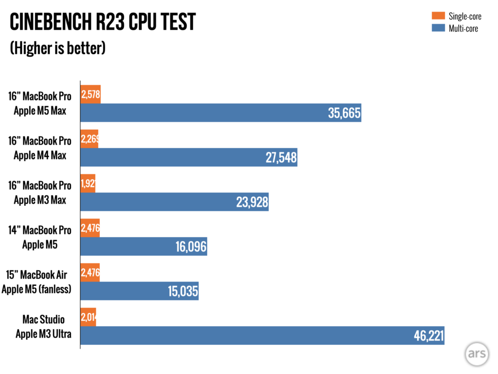 При тестировании чип M5 Max показал производительность примерно на 10% выше, чем чип M4 Max в прошлогоднем 16-дюймовом MacBook Pro, при оценке производительности в одно ядро. Многоядерная производительность варьировалась сильнее – один тест (Cinebench R23) показал значительный скачок в 30%, но в большинстве других тестов наблюдалось меньшее, примерно 10-12% улучшение.