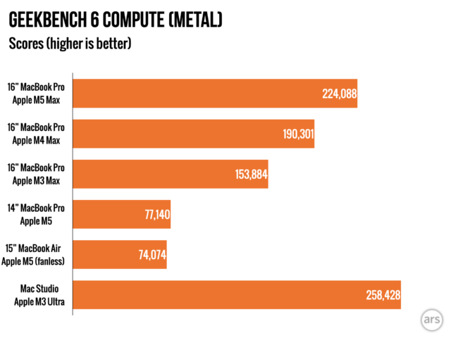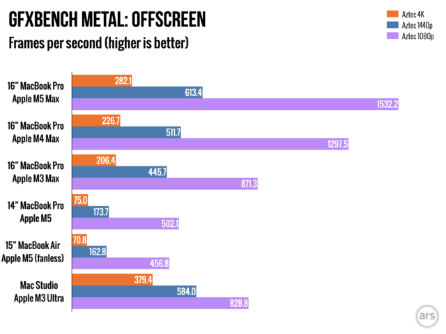 Производительность при выполнении ресурсоёмких задач значительно улучшена благодаря новым чипам. M5 Pro и M5 Max, особенно 18-ядерные версии, примерно в два раза быстрее, чем оригинальный M5 при обработке интенсивных рабочих нагрузок. Переход от 10 GPU-ядер M5 к 40 ядрам M5 Max обычно приводит к графической производительности, которая в три-четыре раза лучше.