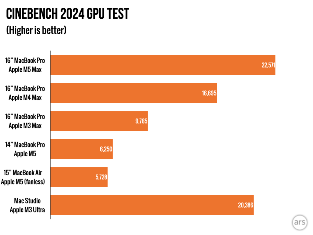 Производительность графики улучшилась на 20–35 процентов в наших тестах. Apple полагает, что вы можете увидеть еще больший прирост при использовании приложений, которые используют специальные нейронные вычисления, встроенные в графический процессор чипа M5.