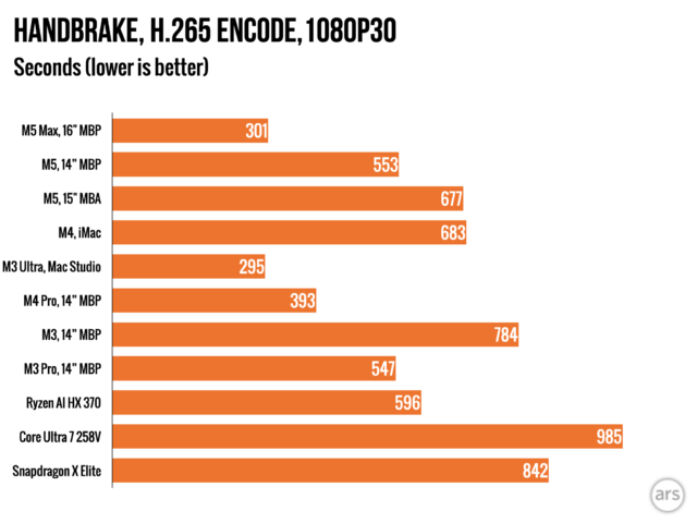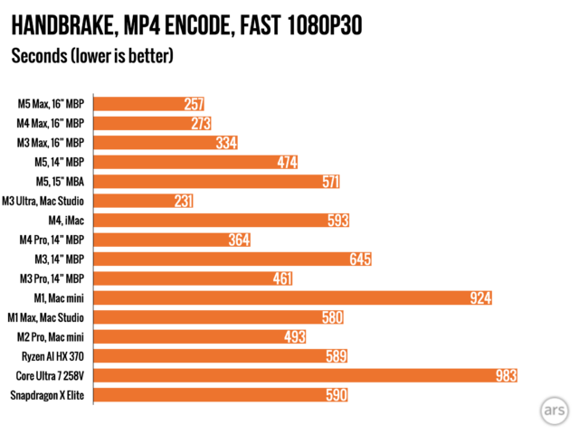 Завершим рассмотрение того, как процессор M5 Max справляется с требовательной, длительной задачей: преобразованием видео с помощью программы Handbrake.