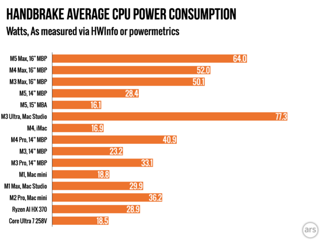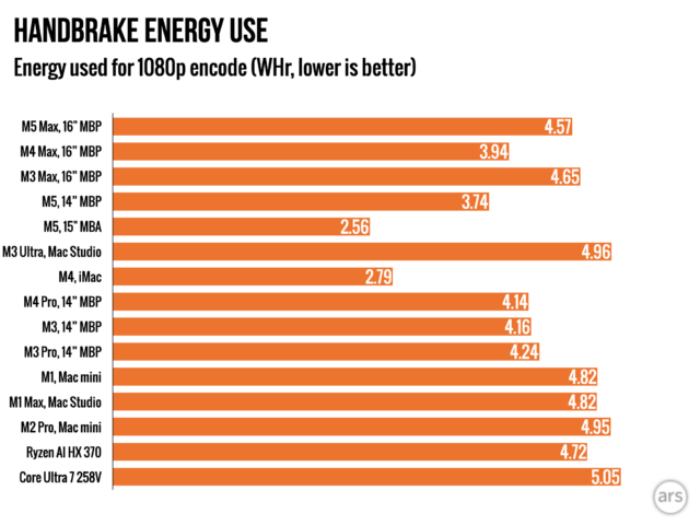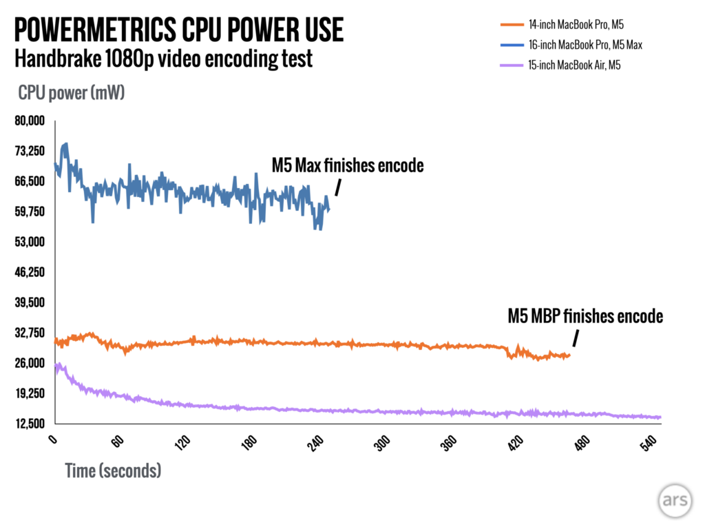 Я протестировал энергопотребление чипа M5 Max, используя инструмент под названием `powermetrics` во время кодирования видео с помощью Handbrake, и обнаружил, что он потребляет примерно на 23 процента больше энергии, чем M4 Max. Это означает, что для выполнения одной и той же задачи требуется немного больше энергии. Я увидел аналогичную разницу при сравнении M4 и M5. Однако, если смотреть на общую картину, энергоэффективность практически соответствует тому, что мы видели от предыдущих чипов Apple Silicon.