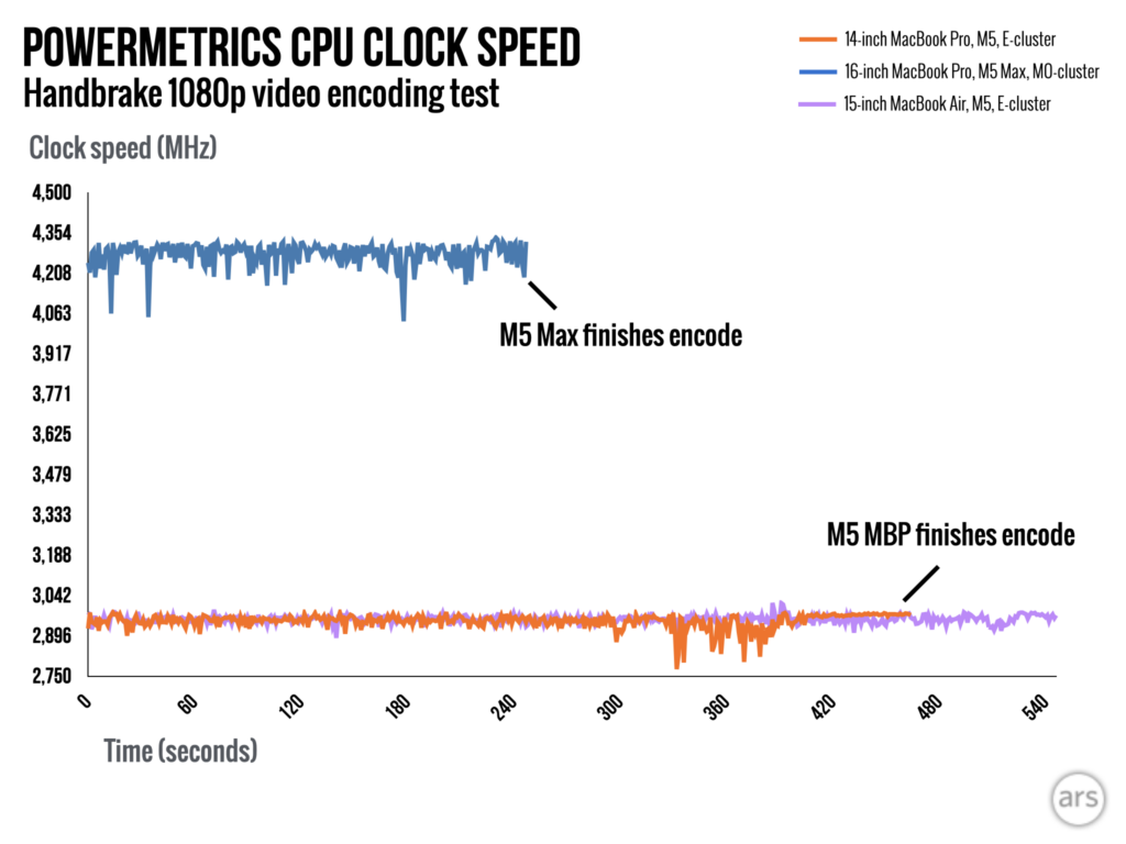 Я тестировал чип M5 в своём 14-дюймовом MacBook Pro, и это действительно интересно, как работает скорость. Сначала он достигает пика около 4.24 GHz со всеми четырьмя мощными ядрами, работающими на полную мощность, но он может удерживать это всего чуть менее минуты. Затем он немного снижается до примерно 4.1 GHz и в конечном итоге стабилизируется около 4.0 GHz по мере продолжения теста. Стоит отметить, что M5 в MacBook Air – без вентилятора – запускается с более низкой скоростью, замедляется быстрее и в конечном итоге поддерживает стабильную скорость около 3 GHz.