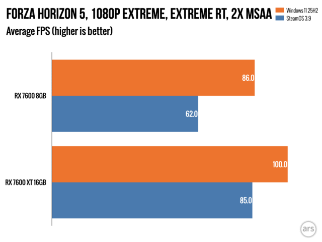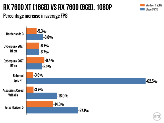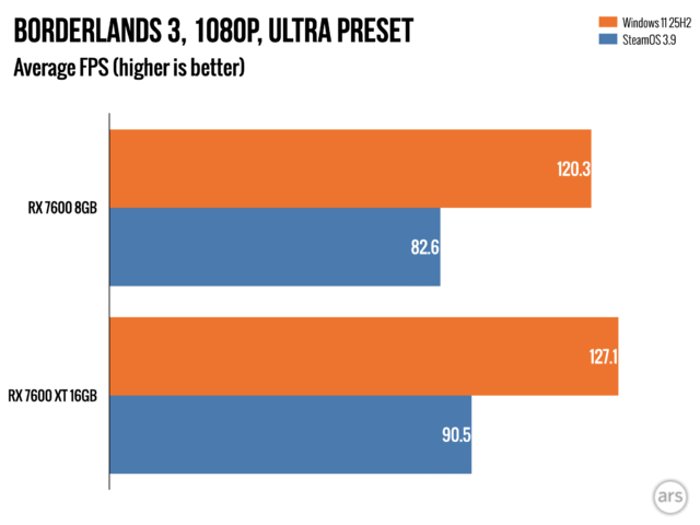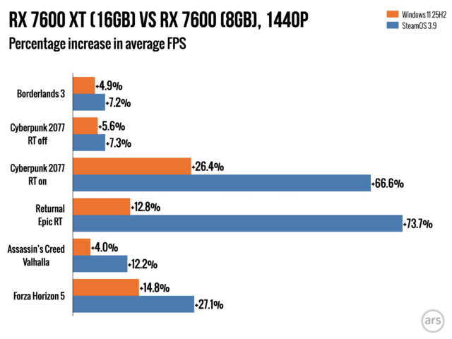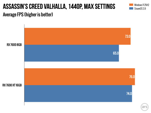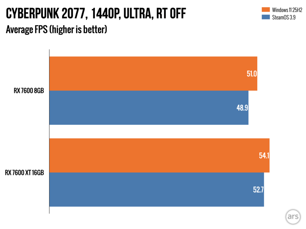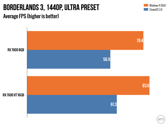 В ходе нашего тестирования мы заметили, что некоторые игры ограничены объемом доступной оперативной памяти, особенно при игре в разрешении 1440p в Windows. Однако, более глубокое тестирование с бета-версией SteamOS показало, что графические процессоры (GPU) с всего 8 ГБ оперативной памяти показывают еще худшие результаты в SteamOS, чем в Windows 11, даже при запуске одних и тех же игр с одними и теми же настройками.