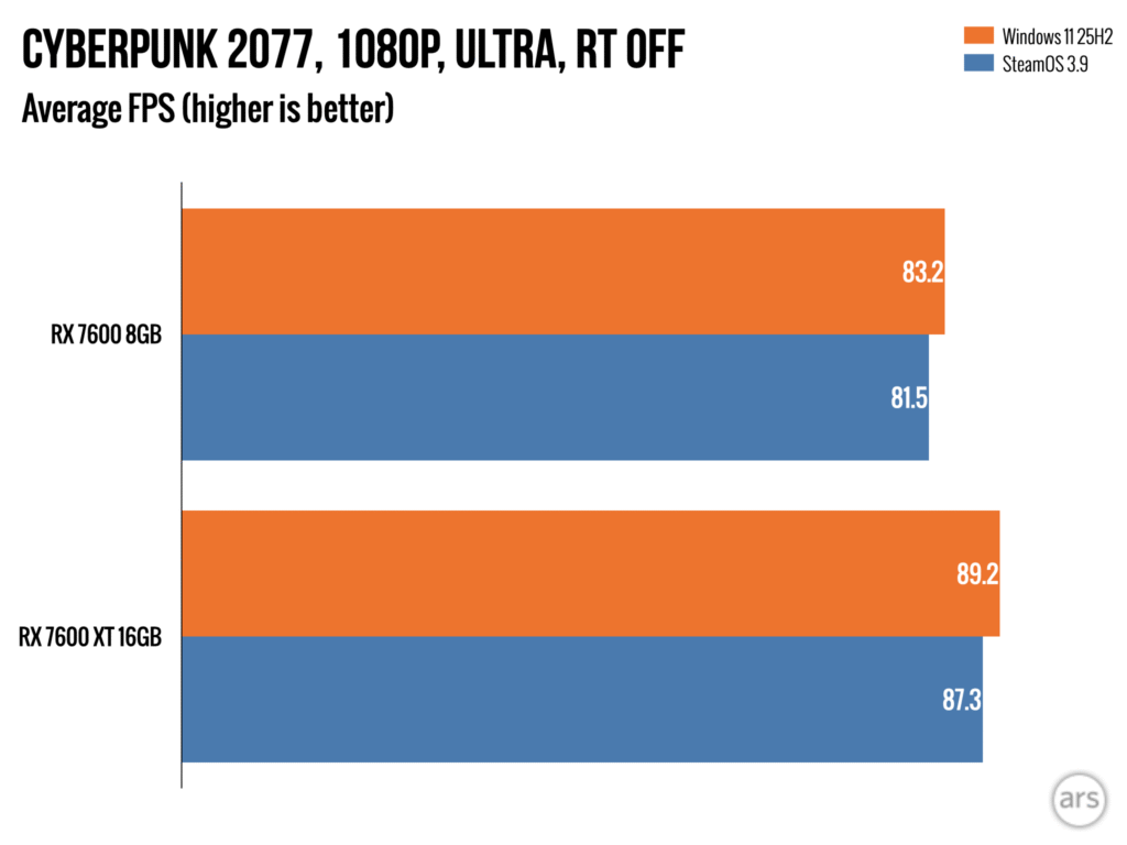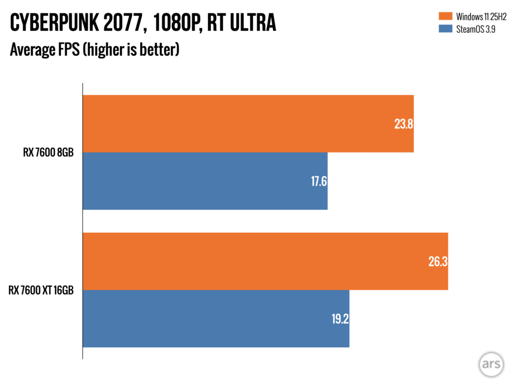 При игре в такие игры, как *Borderlands 3* и *Cyberpunk 2077* (без трассировки лучей), производительность примерно одинакова на обеих видеокартах. Однако разница в производительности становится более заметной в *Cyberpunk 2077* при разрешении 1440p, когда включена трассировка лучей. Эта проблема распространяется и на другие игры с трассировкой лучей, такие как *Returnal* и *Forza Horizon 5*, даже при разрешении 1080p. Интересно, что даже в более старую игру, как *Assassin’s Creed Valhalla*, наблюдается большая разница в производительности между двумя видеокартами при запуске на SteamOS по сравнению с Windows 11.