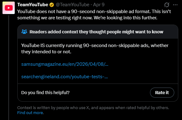 YouTube уточнил, что необычно длинная, не пропускаемая реклама, которую видели некоторые пользователи, была вызвана техническим сбоем. Представитель объяснил, что таймеры, отображаемые для более короткой рекламы, некорректно показывали более длительную продолжительность. В настоящее время они устраняют проблему и подтвердили, что не используют 90-секундную, не пропускаемую рекламу, и это не было тестом.