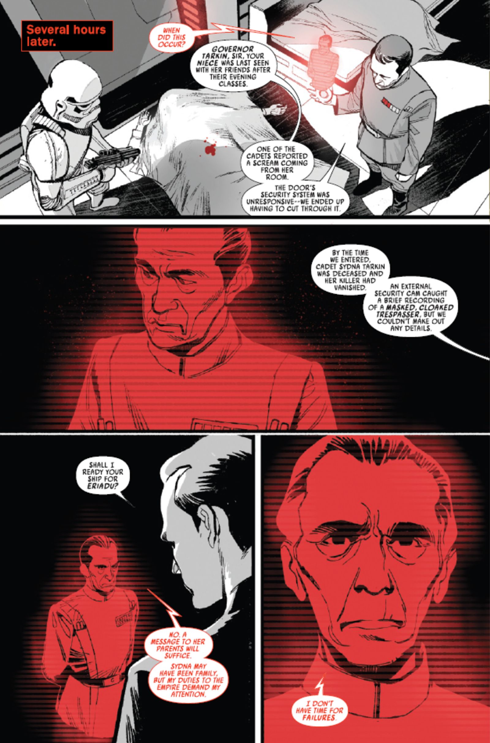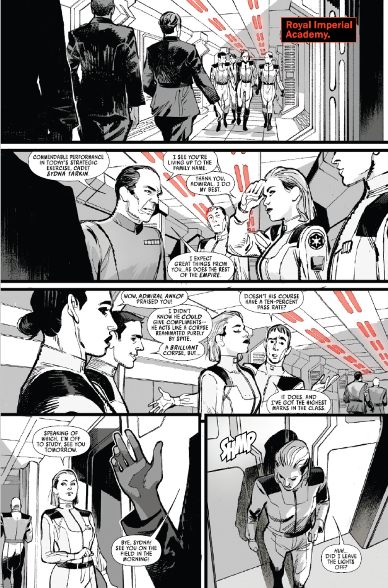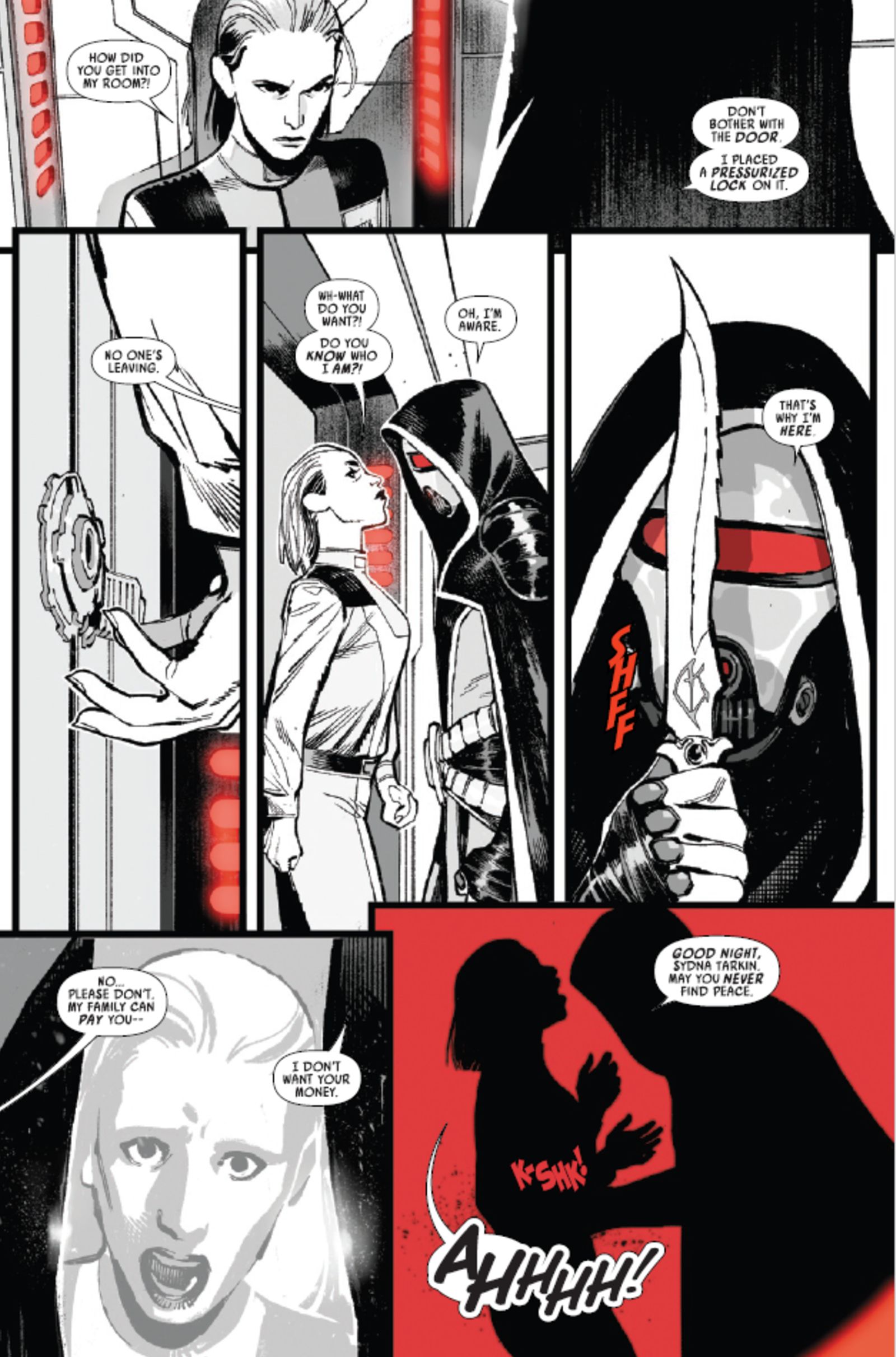 Предварительный просмотр Star Wars: Boba Fett — Black, White & Red #4 (от Алиссы Вонг, Сары Пичелли, Рашель Розенберг и Джо Караманья) показывает юного кадета Сидну Таркин, надеющегося расслабиться после завершения тренировочного упражнения. Однако убийца не позволяет ей отдохнуть. Еще более тревожно то, что ее дядя, губернатор Вильхуфф Таркин, обвиняет Сидну в собственной смерти и не проявляет никакого намерения скорбеть о ней или добиваться справедливости.